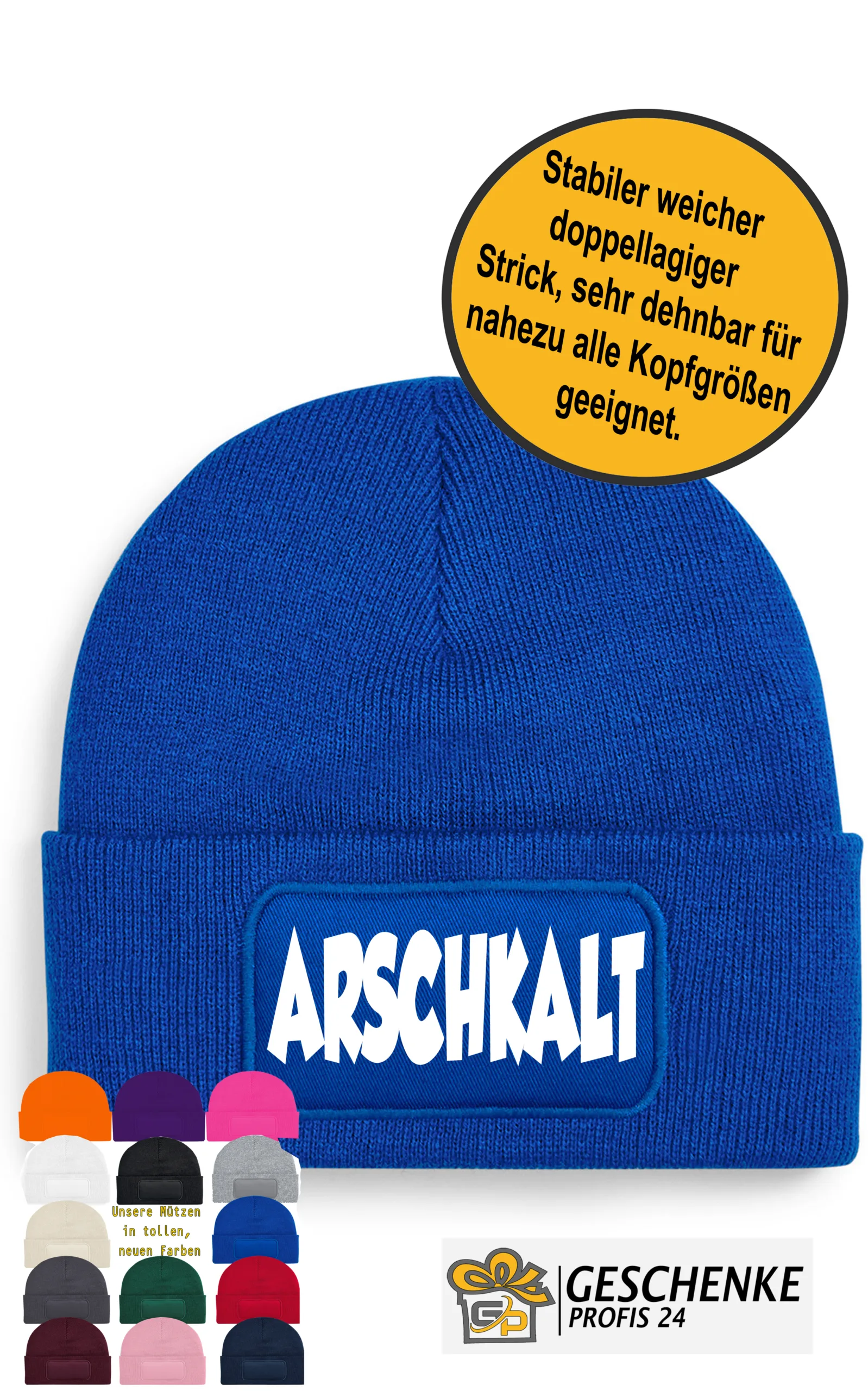 Sie erwerben hier eine neue und ausgefallene Beanie Mütze mit lustigem Aufdruck „Arschkalt“ für Herren, Männer und Kinder. Sie wollen einen ganz besonderes Geschenk für sich oder als personalisiertes Geschenk für Freunde. Eine Mütze als Partygag oder einfach für den Alltag. Eine Wintermütze für Fasching mit Ihrer Zunft.
