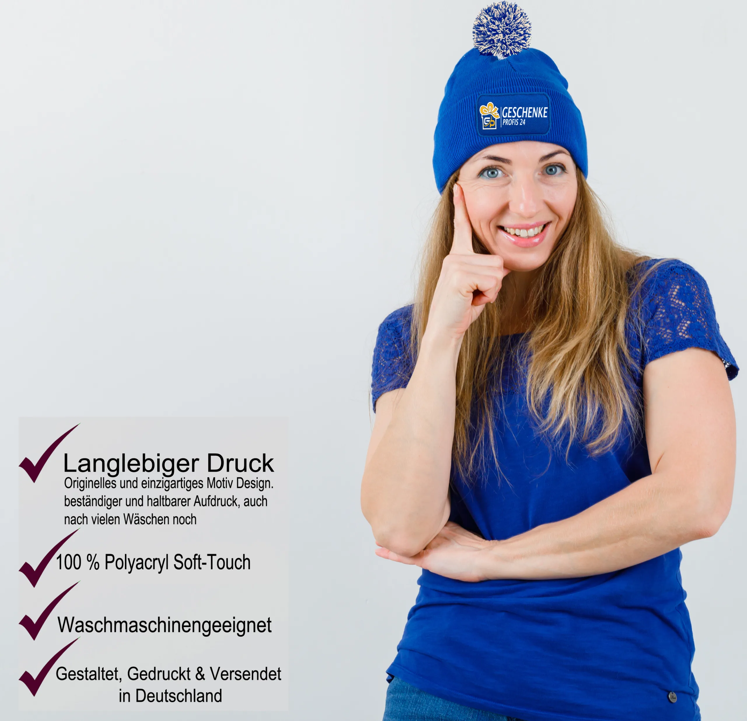 Unsere Mützen sind eine unschlagbare Kombination aus Weichheit und Wärme, hergestellt aus aus hochwertigem, 100% weichem Polyacryl ( Soft Touch),