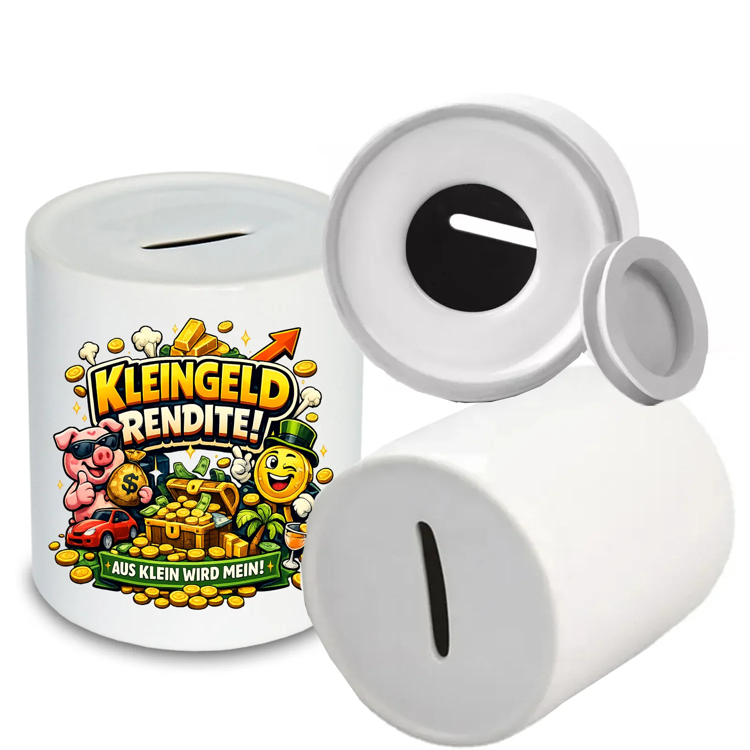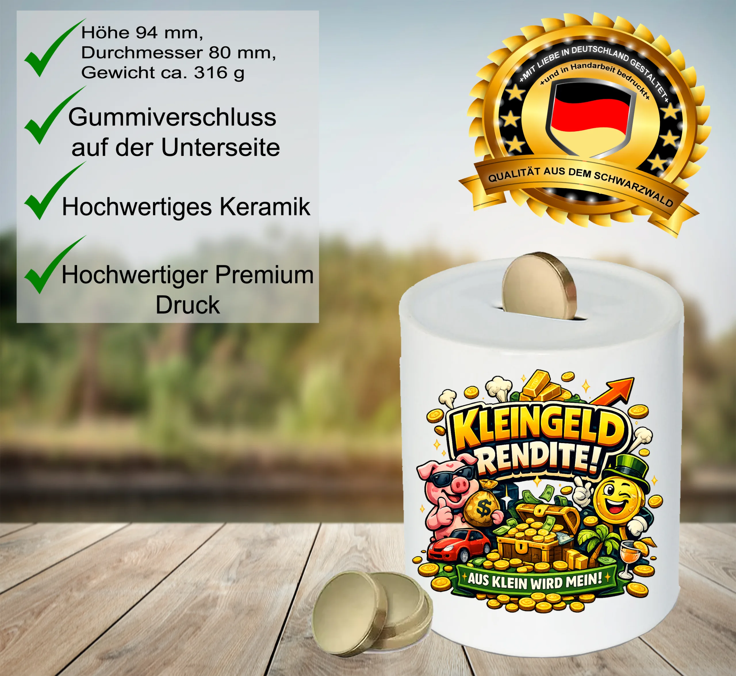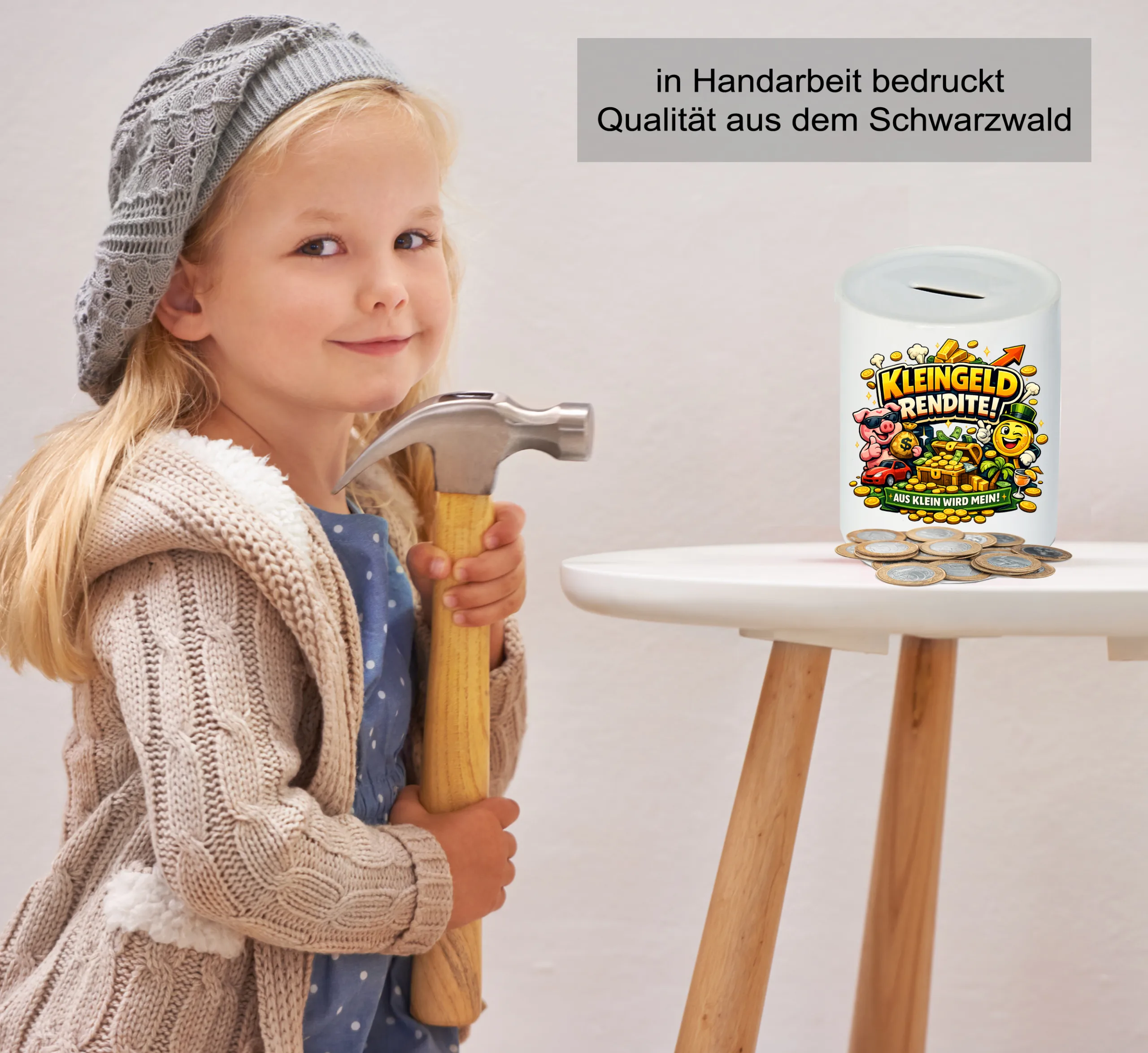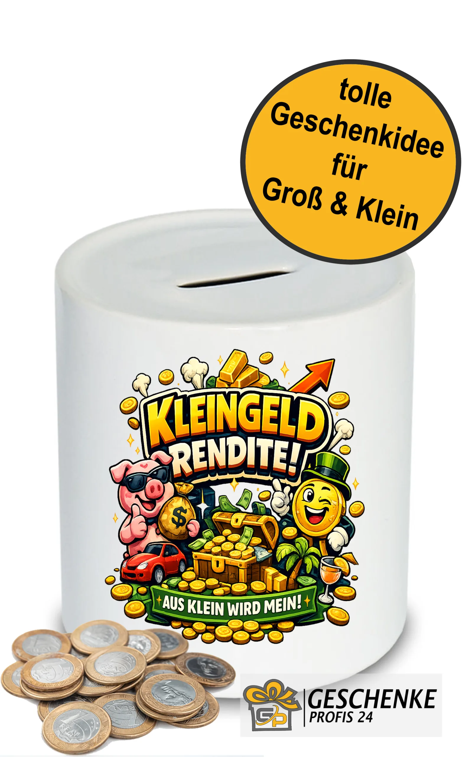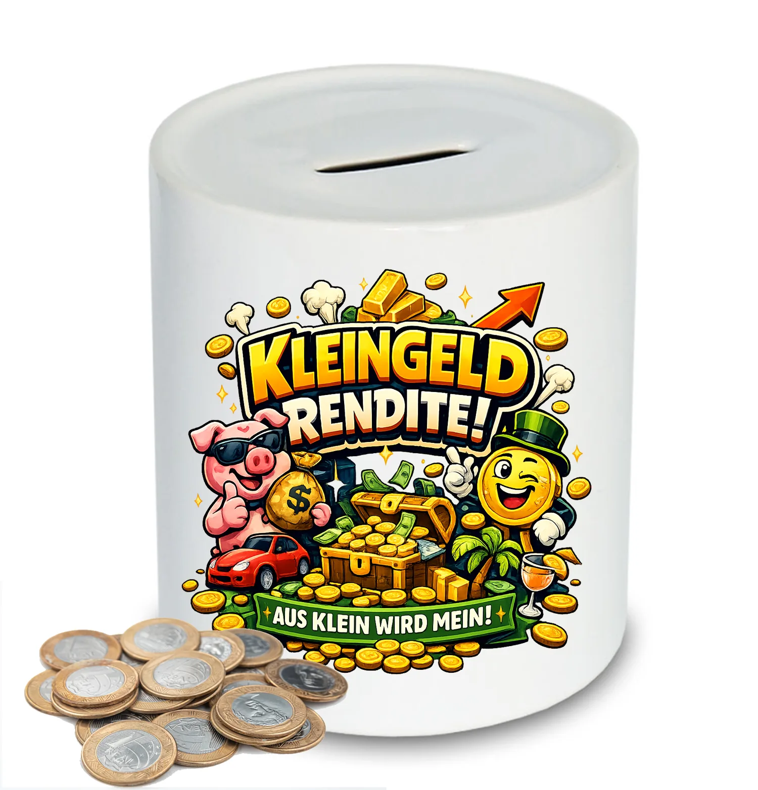 Mit dem humorvollen Motiv „Kleingeld Rendite“ wird Sparen zum Spaß – ideal für Kinder und Erwachsene,