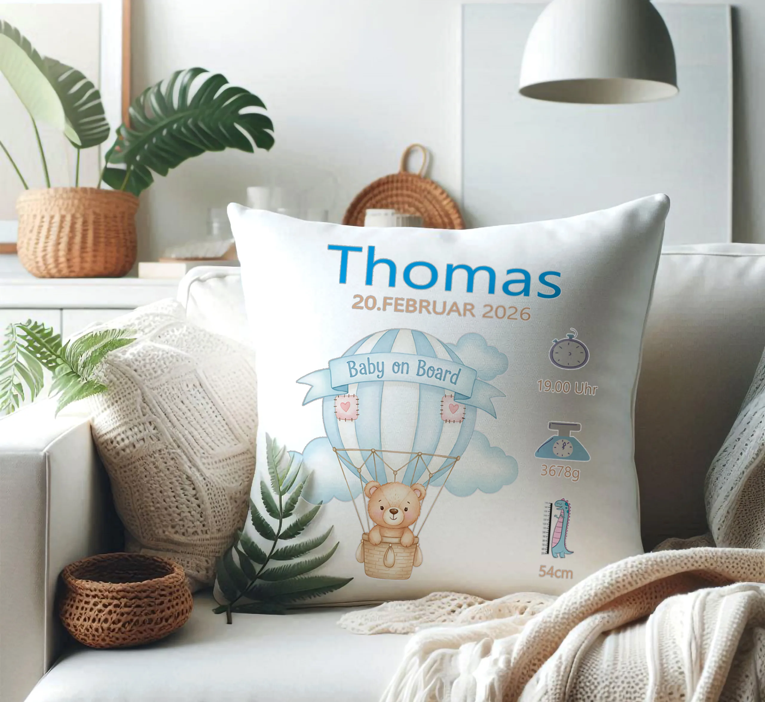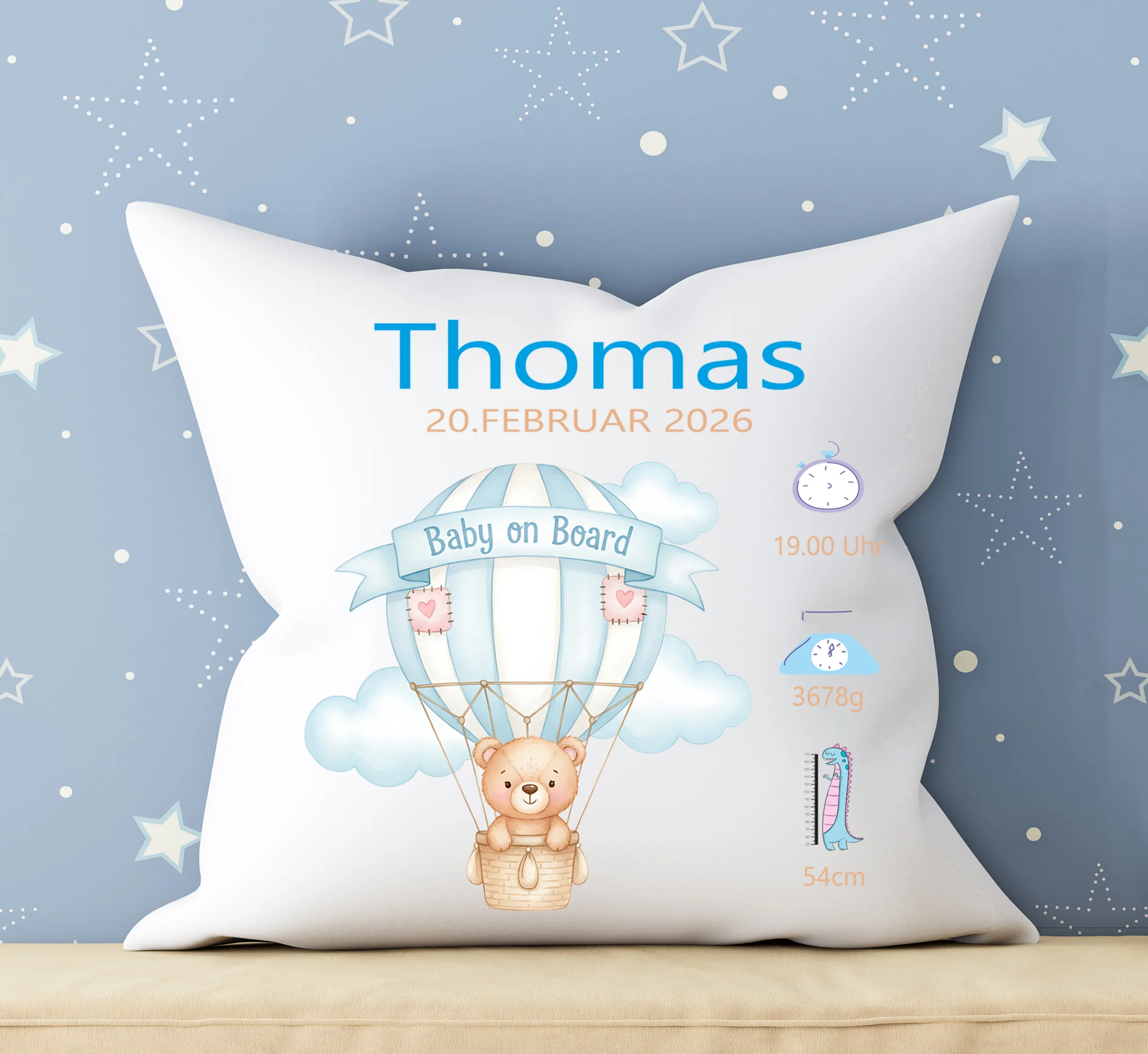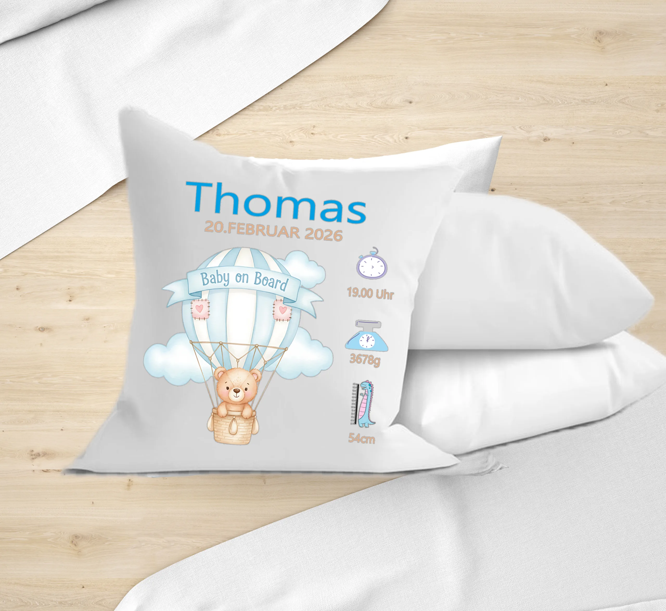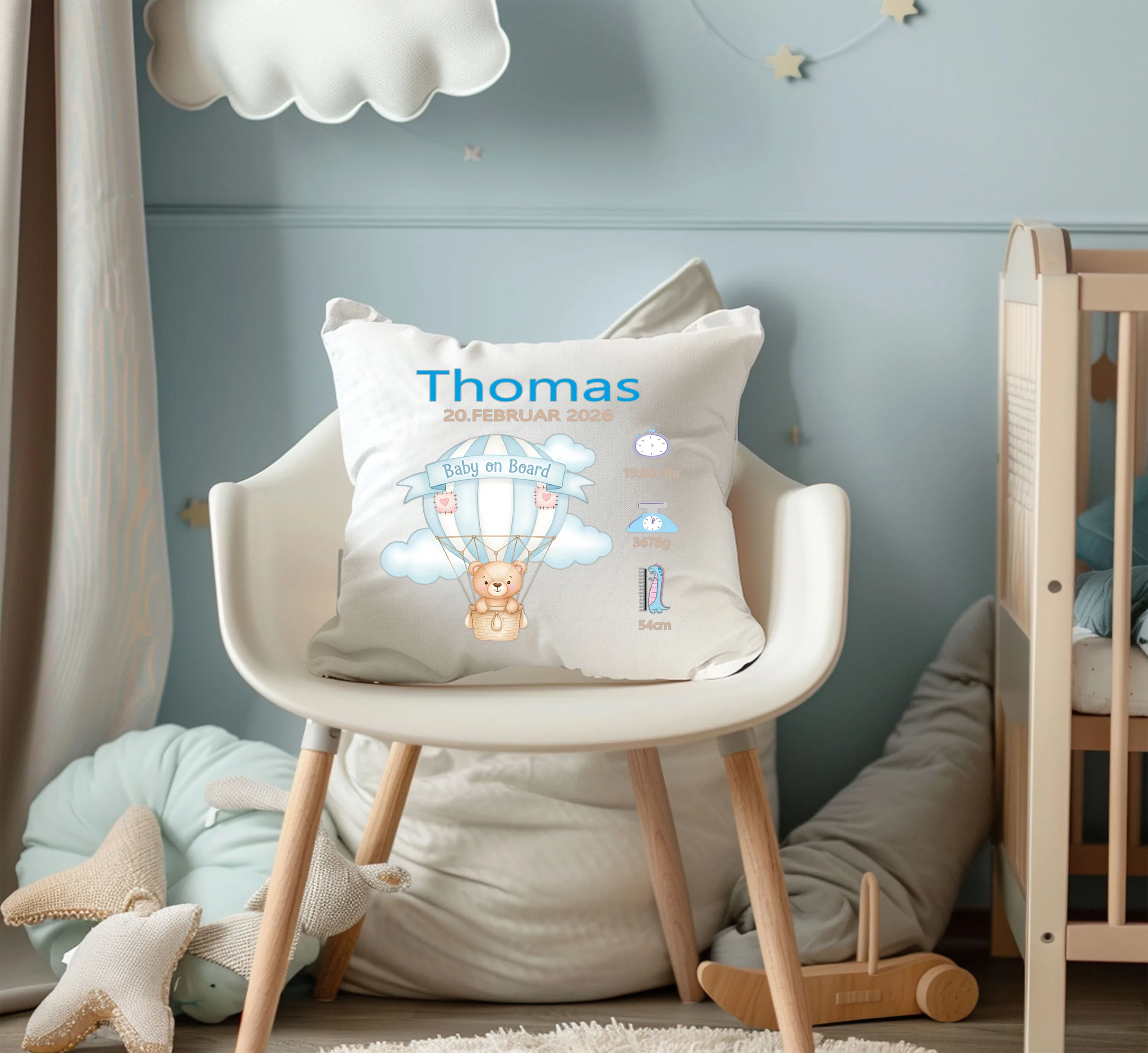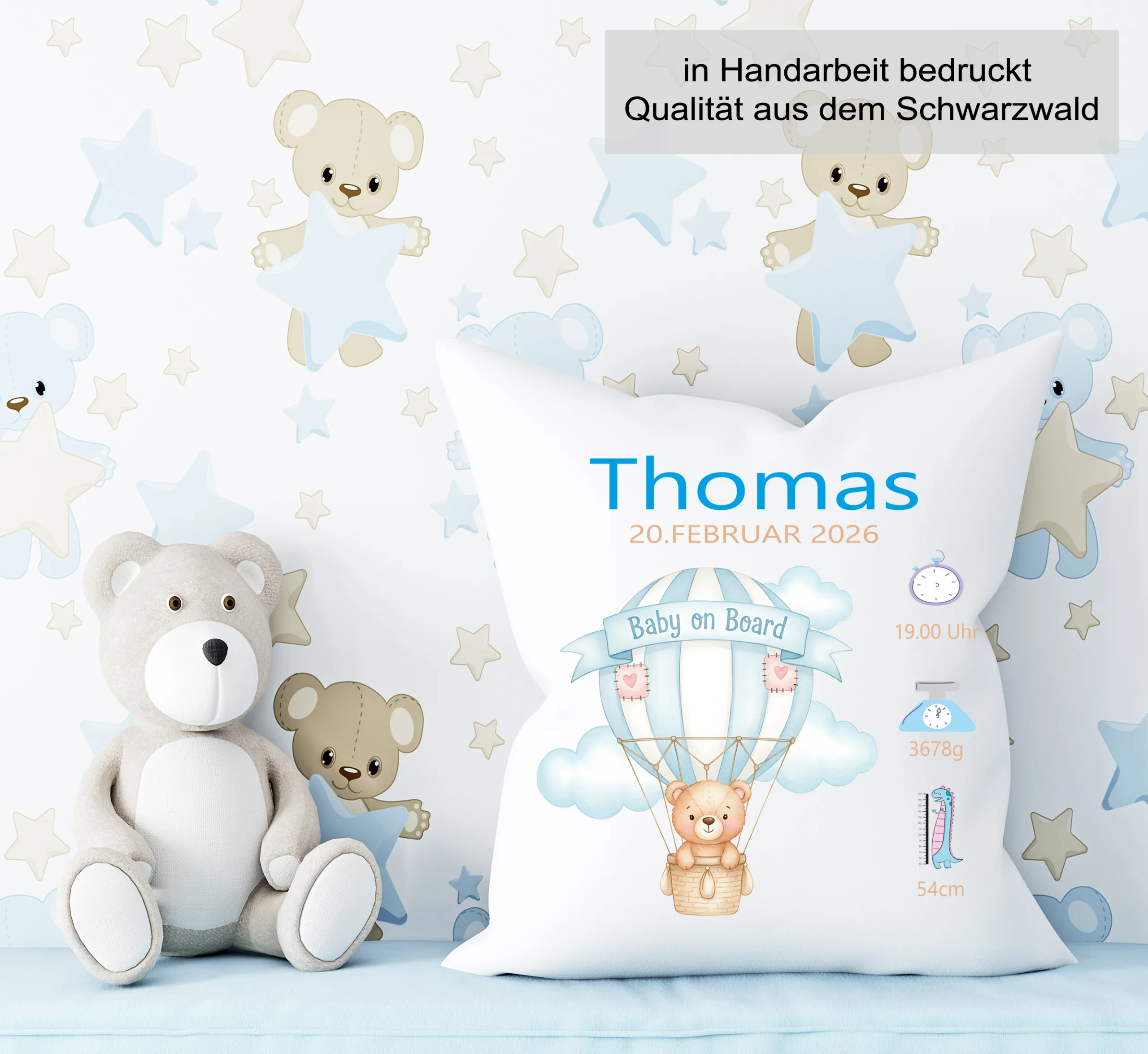 „Ein hochwertiges Personalisiertes Kissen Teddybär im Ballon zur Geburt „