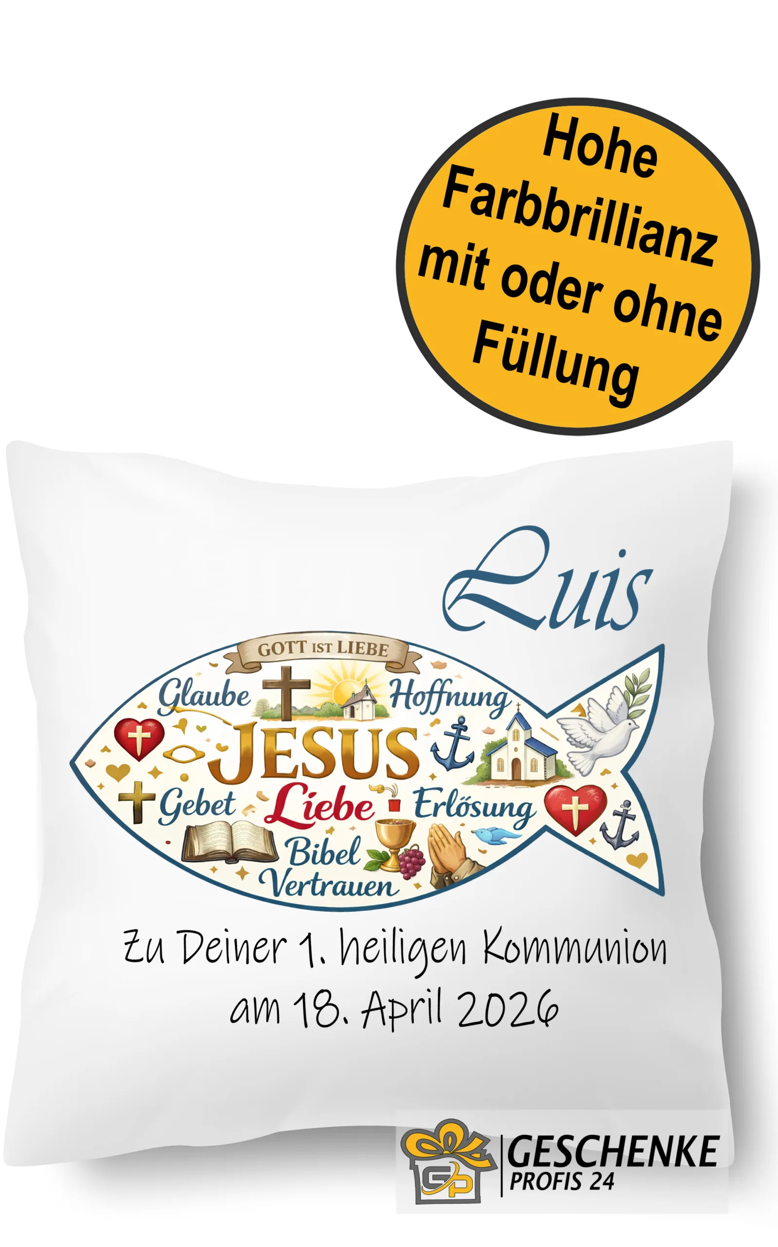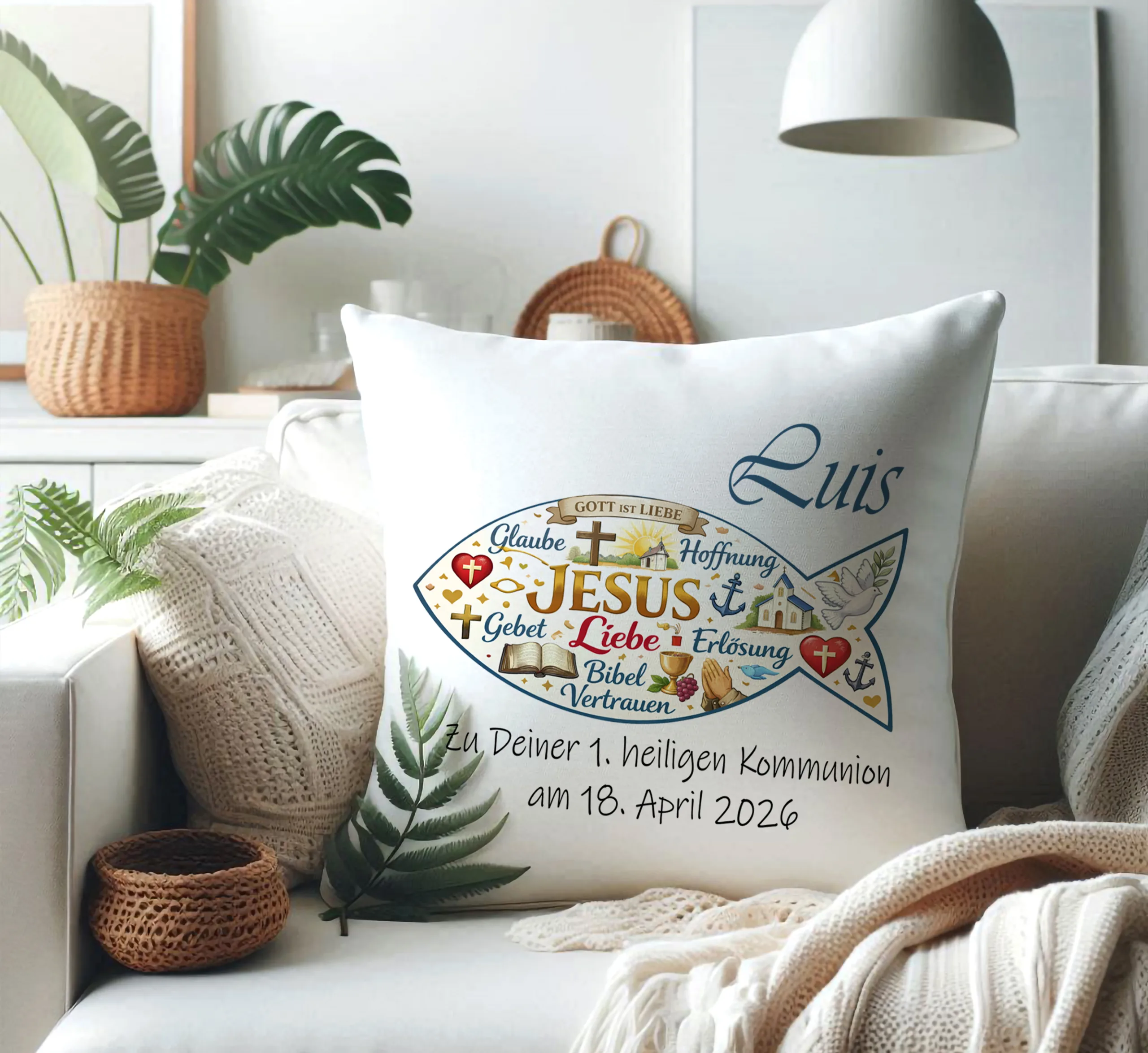 Sie erwerben hier einen neues und ausgefallenes Personalisiertes Kissen zu Kommunion mit Kirchen Symbole Christlicher Fisch mit Namen und Datum, Deko Kissen, Kissenhülle mit Füllung für Männer, Frauen und Kinder. Sie wollen einen ganz besonderes Geschenk für sich oder als personalisiertes Kissen für Freunde. Ein Geschenk als Partygag oder einfach für den Alltag. Dann sind Sie hier genau richtig!