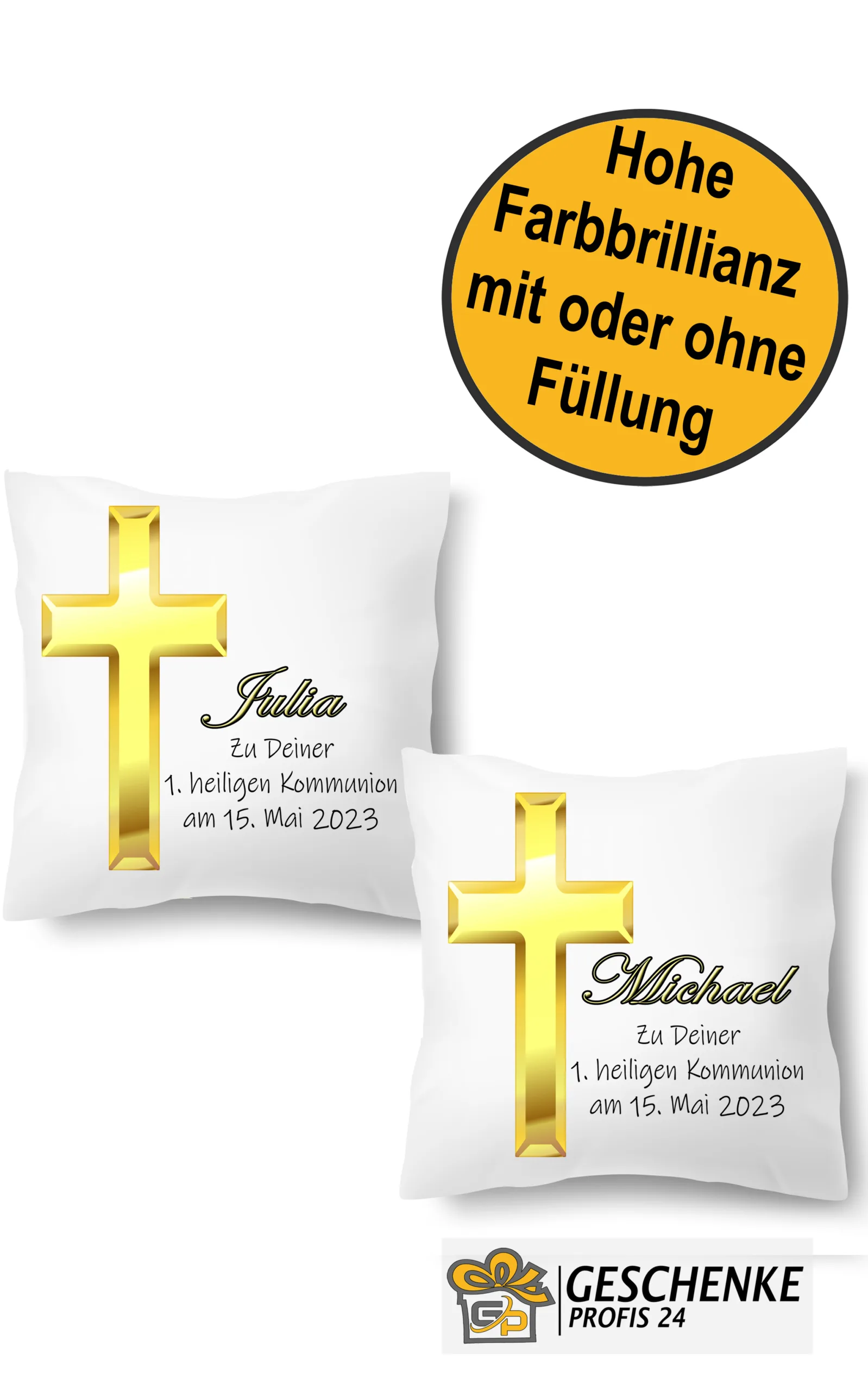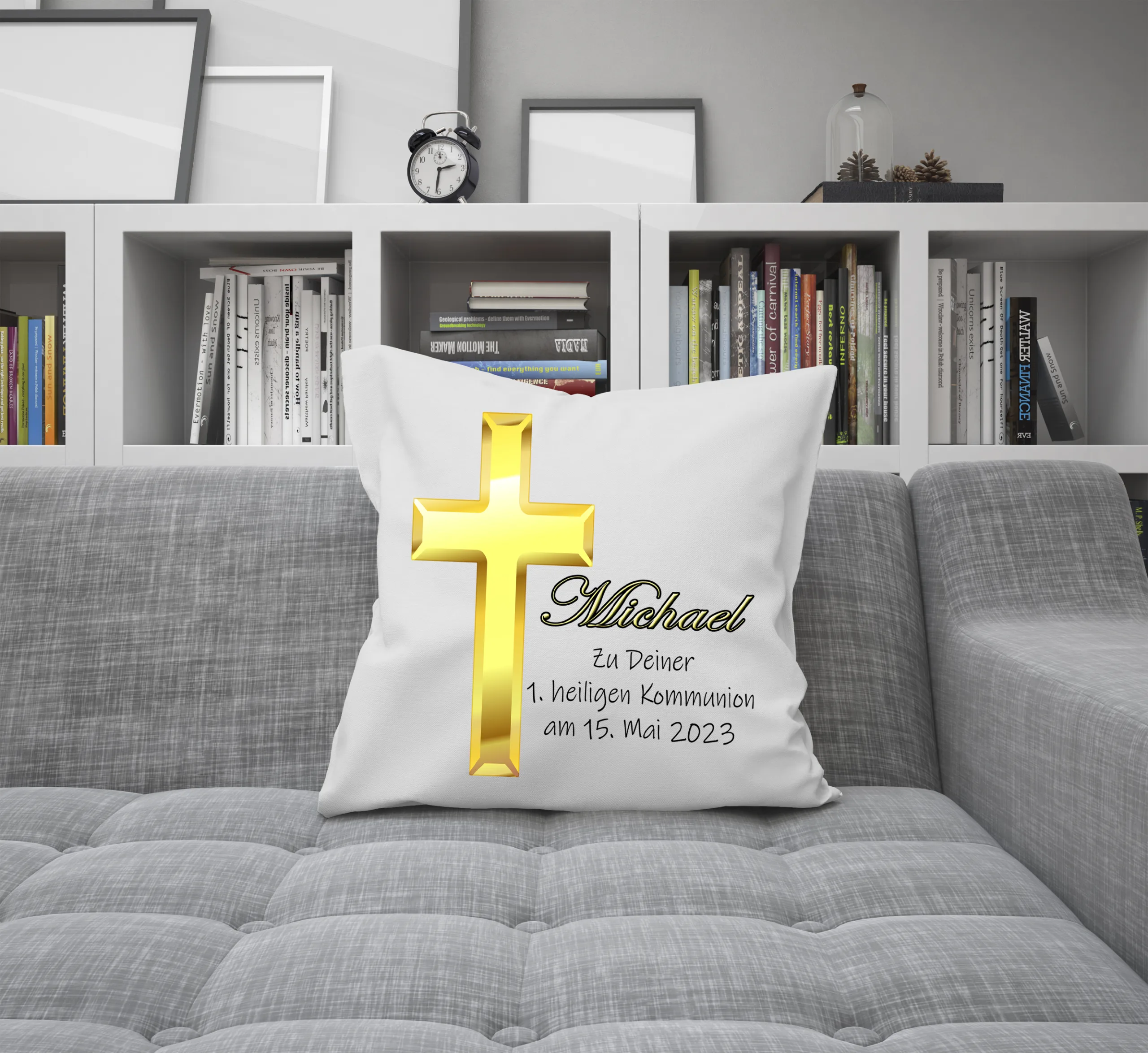 Personalisiertes Kommunion Kissen mit Namen, Kreuz Gold Motiv– liebevolles Geschenk zur Erstkommunion